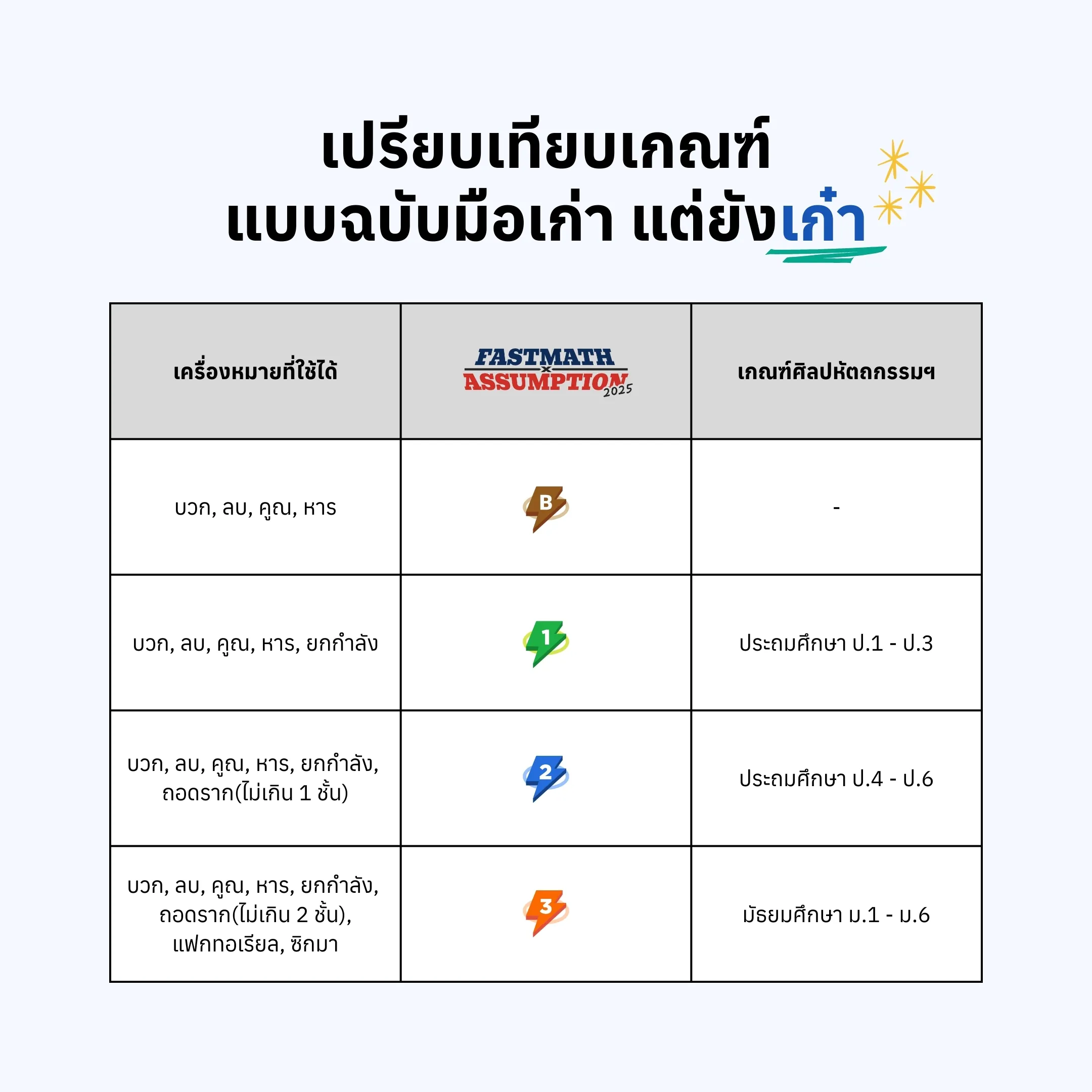 ในบทความนี้ เราจะมาไขข้อข้องใจและทบทวนความหมายของ “ระดับ” ต่าง ๆ บน Fastmath.io กันว่า แต่ละระดับหมายความว่าอะไร ต่างจากงานแข่งอื่น ๆ หรือไม่ เพื่อเป็นการเตรียมพร้อมก่อนการแข่งขัน Fastmath x AC Championship 2025